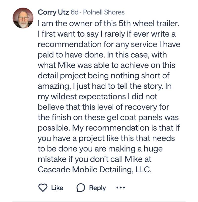 Cascade Mobile Detail LLC offers professional mobile car, truck, RV, and boat detailing in Mukilteo, Island County, and surrounding areas. Our certified detail technicians specialize in interior and exterior car detailing, including deep interior cleaning, stain and odor removal, paint correction, oxidation removal, polishing, waxing, and ceramic coating. Using eco-friendly, safe products, we bring convenient, on-site auto detailing directly to your home or workplace. Whether you need routine car washing, full-service detailing, or specialized RV and boat care, our mobile detailing services are designed to restore your vehicle’s shine, protect its surfaces, and increase its value. Schedule your mobile detail today for fast, reliable, and professional service you can trust..